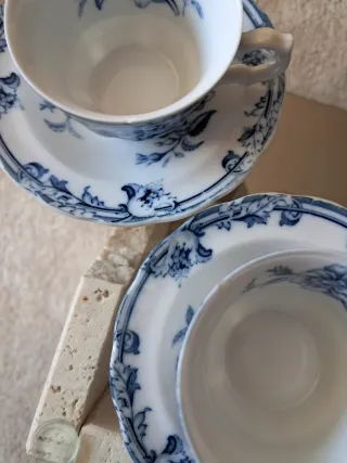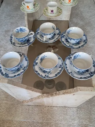 Elegante juego de té de porcelana japonesa con un delicado diseño floral en azul. - Incluye 6 tazas. - Incluye 6 platillos. - Diseño floral azul sobre fondo blanco. Dos pequeños roces en dos bordes de tazas.
