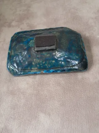 Cenicero artesanal con acabado Raku en tono azul vibrante. Su diseño único lo convierte en una pieza decorativa,única. - Técnica Raku. - Color azul con detalles. - Forma rectangular con asa.
