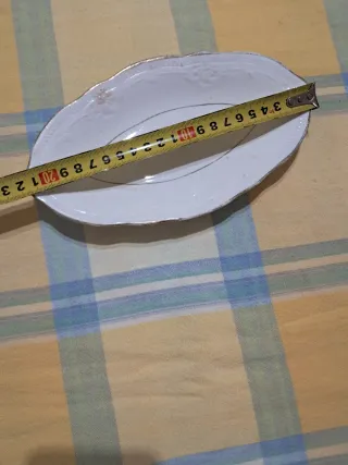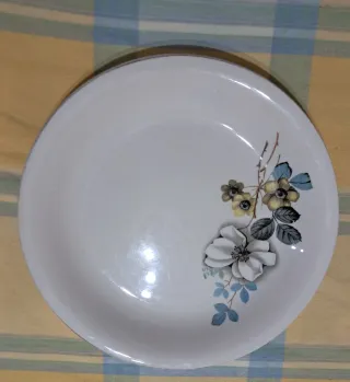 Plato de porcelana con un delicado diseño floral.Su antigüedad está entre 1940 y 1965.Tiene 23,5cms de diámetro y 3 de alto - Color blanco roto. - Motivo de flores amarillas y blancas con hojas azules. - Borde con un fino ribete dorado.Fino craquelado.Estupendamente conservado.
