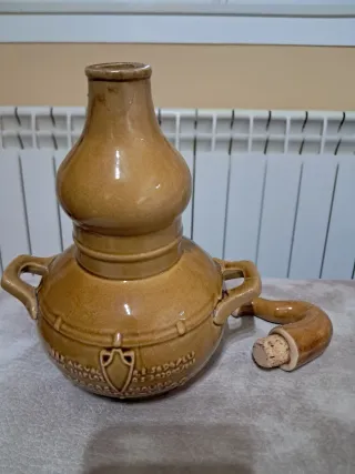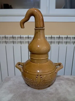 Botella-alambique de cerámica,con un diseño tradicional;para licores,etc. - Material: Cerámica. - Color: Tostado. - Diseño con asas laterales. - Detalle de inscripción en la base.