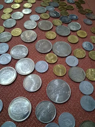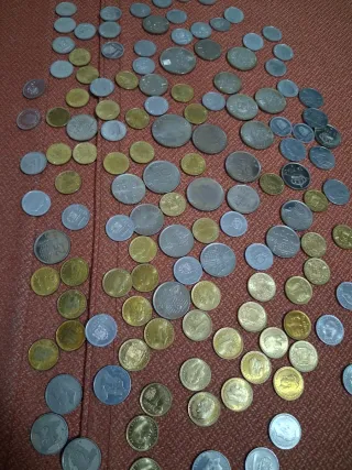 Vendo colección de 131 monedas de mi tío. Algunas monedas presentan grabados de escudos, figuras y leyendas. Muchas están sin circular. Sobre todo las grandes. - 131 monedas. - Variedad de diseños y tamaños. - Algunas monedas con inscripciones como PTAS, PESETAS, 100, 50, 25, 1... Acepto ofertas razonables