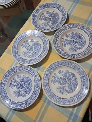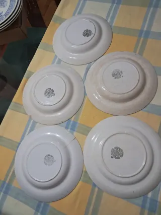 Conjunto de cinco platos de estilo vintage con el diseño" Vargas Segovia".Uno es llano y cuatro hondos. -22,8 y 23cms de diámetro respectivamente. - Diseño clásico en azul y blanco. - Borde decorado con motivos. Tienen las manchas típicas del paso del tiempo,algún desconchado,o debil fisura como puede observarse en las fotos. Ideales para coleccionistas.