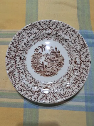 Precioso plato vintage de La Cartuja de Sevilla con un diseño detallado. - Diseño clásico en tono marrón. - Borde decorado con un patrón intrincado. - Pieza de colección.