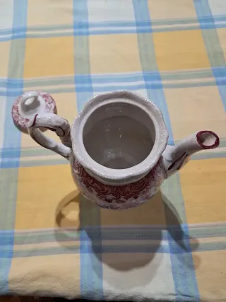 Cafetera antigua de La Cartuja de Sevilla de más de cien años,con un diseño floral en color burdeos y un bonito craquelado que le ha dado el paso del tiempo. - Pieza de colección. - Diseño clásico y elegante. La tapa pertenece a una cafetera menos antigua.
