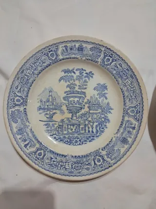 Conjunto de dos platos de cerámica con diseño clásico de mediados del SigloXX (años 50-70,aproximadamente) - Un plato llano y otro hondo. - Diseño" Vargas Segovia ",en azul. - Motivos decorativos de paisaje y jarrón. 12 euros los dos