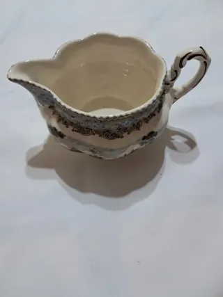 Lechera de la marca Cartuja, modelo Viejo Molino. Pieza de cerámica con un diseño clásico. - Diseño con detalles ornamentales. - Asa y borde decorados. Tiene ligeras manchas en pate de abajo.