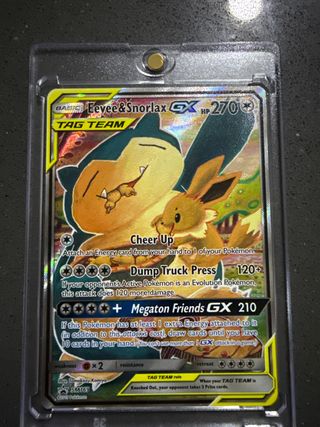 Carta Pokémon de Eevee & Snorlax GX, TAG TEAM. - Ataque Megaton Friends GX con 210 de daño. - Ataque Dump Truck Press con 120+ de daño. - Habilidad Cheer Up. - HP: 270. - Ilustración de Tomokazu Komiyo.
