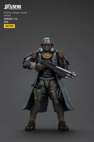 Figura de acción detallada de la línea Shadow Jaeger Squad de Joytoy, modelo Jackal. - Diseño inspirado en el universo Battle for the Stars. - Incluye accesorios y armamento. - Escala 1:18. - Figura nueva, nunca sacada de su empaque original
