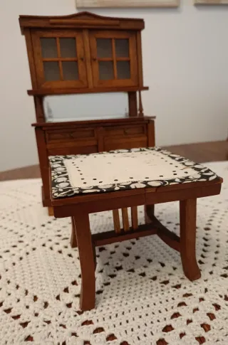Muebles modernistas principios del 1900 muy bien hechos y con mucho detalle mesa estensible. - Mueble vitrina con puertas de cristal y espejo biselado. - Mesa con mantel decorado. - Cajones en la parte inferior del mueble.