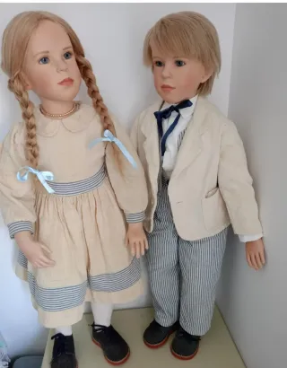 Conjunto de dos muñecos vintage de Waltershausen, diseñados por Vera Scholz. Representan a un niño y una niña con vestimenta clásica,son grandes miden 75 cm traen su certificado original con su número de serie. - Muñeca con vestido beige y detalles azules. - Muñeco con traje de chaqueta y pantalón a rayas. - Cabello rubio trenzado en la muñeca. - Ojos azules y rasgos detallados.