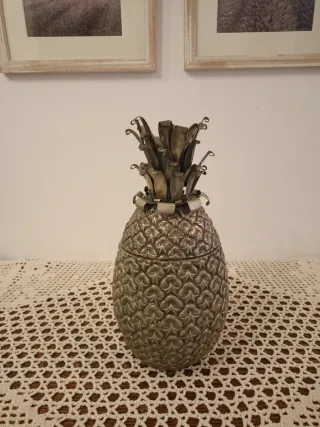 Magnífica pieza decorativa con forma de piña, diseñada en Italia por Mauro Manetti en los años 60 Su intrincado diseño le da un toque de elegancia,mide 32 cm. - Diseño inspirado en la piña. - Fabricado en metal con acabado plateado. Mauro Manetti fue un diseñador de joyas y orfebre italiano que fundó su propia empresa de joyería, Manetti & Roberts, a principios de la década de 1960. Manetti se especializó en la creación de piezas de joyería de oro y diamantes de alta gama, a menudo incorporando diseños audaces e intrincados inspirados en la naturaleza, el arte y la historia.