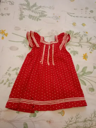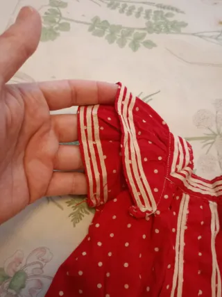 Vestido rojo con pequeños lunares blancos, pertenecía a una muñeca las Jumeau boca cerrada . Presenta detalles de puntilla blanca en mangas y cuello. Tiene algunas manchitas.Mide 40 cm de largo. - Diseño de lunares blancos sobre fondo rojo. - Adornos de puntilla en mangas y cuello. - Borde inferior con doble franja de puntilla.