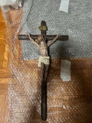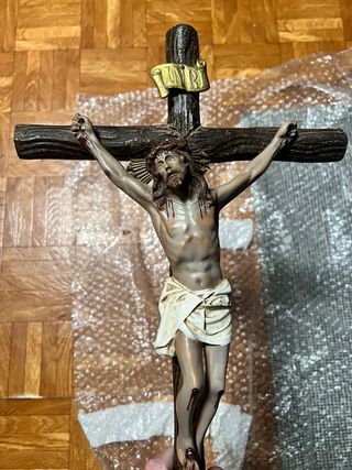 Detallado crucifijo de madera con la figura de Jesús. - Material: Madera. - Diseño: Figura de Jesús en la cruz. - 48x25 alto/ancho