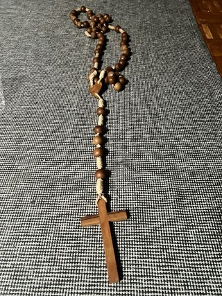 Este rosario de madera es un bonito objeto decorativo. - Elaborado con cuentas de madera. - Incluye una cruz de madera. - Cuerda de yute para unir las cuentas.
