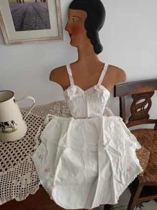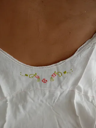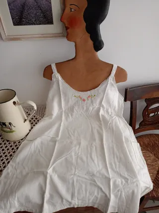 Prenda de ropa interior antigua, de 1920 1930 - Diseño de tirantes finos. - Detalle bordado floral en el escote. - Tejido blanco ligero.