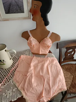 Conjunto de ropa interior antigua años 20 o 30 en color rosa pálido. - Sujetador con tirantes finos, detalles de encaje y camiseta - Braguita con bordados florales y ribete de encaje.