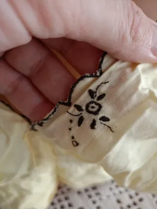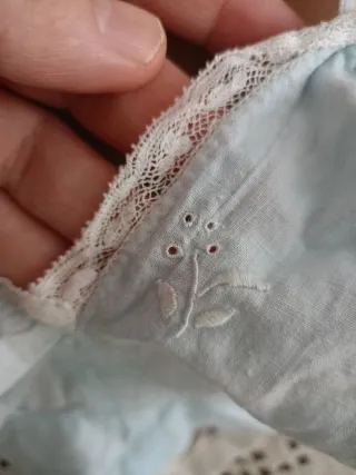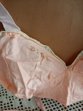 Precioso sujetador de época, probablemente de los años 20 o 30. Una pieza vintage con encanto. - Tejido ligero de algodón. - Detalle de encaje en el borde. - Bordados florales sutiles. - Cierre con corchetes.