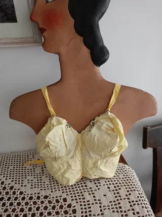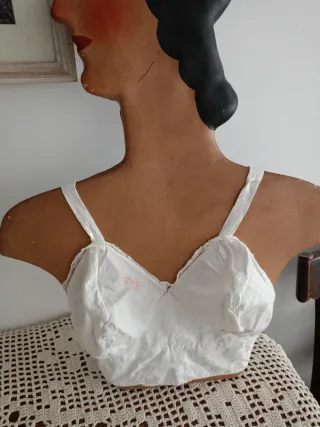 Precioso sujetador antiguo años 20 o 30 de tela blanca con detalles de encaje. - Diseño vintage. - Tiras ajustables. - Pequeño bordado decorativo.