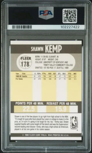 Tarjeta de baloncesto de 1990 Fleer de Shawn Kemp. - Tarjeta clasificada por PSA. - Grado GEM MT 10. - Número de serie 102227422.
