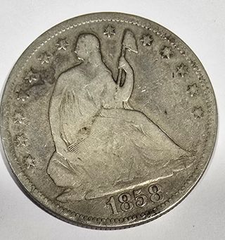 Preciosa moneda de 50 Centavos (Half Dollar) "Seated Liberty" de 1858. 59024 Una pieza con 168 años de historia, ideal para coleccionistas de moneda estadounidense o buscadores de plata histórica. Se encuentra en un estado de conservación "Nicely Circulated" (MBC+/EBC), manteniendo muy buen detalle en el escudo y las líneas de la libertad. Año: 1858 Ceca: [INDICAR AQUÍ: Philadelphia (si no tiene letra) / New Orleans (si tiene una O)] Material: Plata .900 (90% plata pura) Peso: 12,44 g (aprox.) Estado: Circulada con desgaste natural y pátina auténtica. No ha sido limpiada agresivamente, conservando su valor numismático.