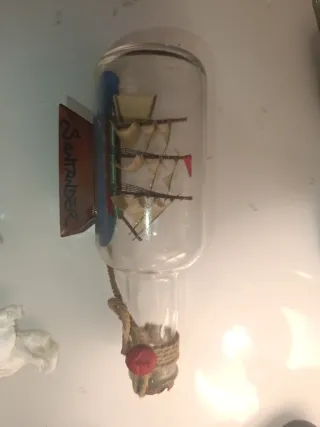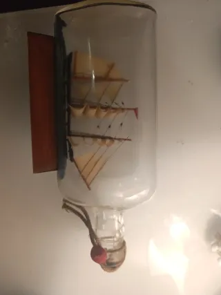 Réplica detallada de un velero clásico, presentado dentro de una botella de vidrio. - Altura aproximada de 23 cm. - Mástiles y velas detallados. - Base de botella con cuerda y adorno.