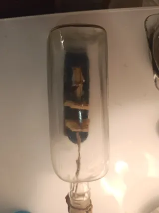Detalle de velero en miniatura dentro de una botella de cristal. Un objeto decorativo único. - Velero de 19 cm de altura. - Montado en botella de cristal. - Cierre con cuerda y sello rojo.