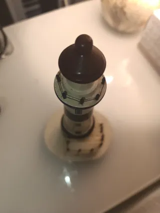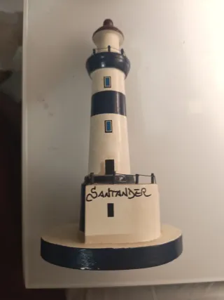 Figura decorativa de un faro con el nombre 'Santander' grabado. - Diseño de faro clásico. - Base redonda con borde azul marino. - Detalles pintados a mano.