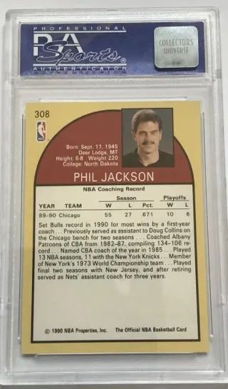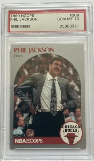 Tarjeta de baloncesto de Phil Jackson de 1990. - Serie: Hoops - Número de tarjeta: #308 - Grado: GEM MT 10 - Certificación PSA: 05308321 - Equipo: Chicago Bulls - Rol: Coach