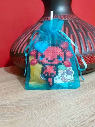 !!Coleccionalos a todos en forma de llaveros pixelados 👾👾!! Os presento a My Melody, con su propia golosina 🍭 incluida!! El producto incluye el llavero, una bolsa de organza (de color aleatorio), una pegatina (aleatoria) y una sorpresa más 🤭 Ideal para colgarlo en las llaves 🔑, carteras 👛, móviles 📱, mochilas 🎒, estuches 👝etc... Incluso se lo puedes regalar a tu mejor amig@ o novi@, si es fan de Hello Kitty !!Hecho a mano 👏👏 con Hama Beads!! Las medidas del llavero son: My Melody {9,7cm x 6cm} y Piruleta {3,5cm x 2,3cm}= Llavero total{11,44cm x 8,32cm}