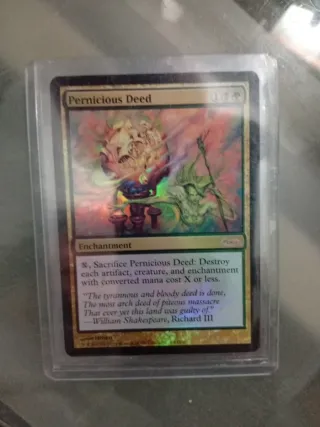 Carta de Magic: The Gathering, Pernicious Deed, edición FOIL DCI. Como nueva. - Tipo: Encantamiento. - Coste de maná: X, 2, Negro. - Habilidad: Sacrificar Pernicious Deed: Destruye cada artefacto, criatura y encantamiento con coste de maná convertido X o menor. - Cita de William Shakespeare, Ricardo III.