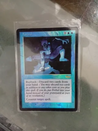 Carta de Magic: The Gathering, Forbid. Como nueva. - Edición FNM (Friday Night Magic). - Carta foil (brillante). - Tipo: Instantáneo. - Coste de maná: 1UU. - Habilidad: Buyback (Recompra). - Efecto: Contrarresta un hechizo objetivo.