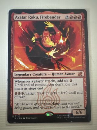 Carta de Magic: The Gathering, Avatar Roku, Firebender. - Tipo: Criatura Legendaria - Humano Avatar. - Coste de maná: 3RR. - Habilidad: Cuando un jugador ataca, añade seis maná rojo. Hasta el final del combate, no pierdes este maná al final de los pasos. - Habilidad activada: {R}{R}: Una criatura objetivo obtiene +3/+0 hasta el final del turno. - Cita: Haz sentido de nuestro pasado, Aang, y traerás paz, y restaurarás el equilibrio al mundo. - Poder/Resistencia: 6/6. - Ilustrador: Toni Infante.