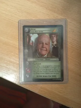 Carta del juego de cartas coleccionables El Señor de los Anillos (LOTR TCG). - Personaje: Bilbo. - Título: Aged Ring-Bearer. - Coste: 2. - Fortaleza: 3. - Heridas: 4. - Resistencia: 8. - Tipo: Compañero Hobbit. - Edición especial: DGMA World Cup 2005.
