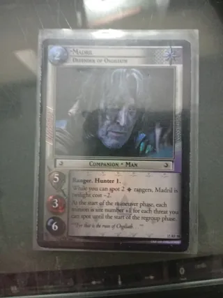 Carta del juego de cartas coleccionables El Señor de los Anillos (LOTR TCG). - Madril, Defensor de Osgiliath. - Código de carta: 15 RF 10. - Tipo: Compañero, Hombre. - Habilidad: Ranger. Hunter 1. Mientras puedas ver 2 rangers, el coste de crepúsculo de Madril es -2. Al comienzo de la fase de maniobras, cada minion es número de sitio +1 por cada amenaza que puedas ver hasta el comienzo de la fase de reagrupación. - Cita: ¡Por eso es la ruina de Osgiliath! - Coste: 2 - Fuerza: 5 - Voluntad: 3 - Daño: 6