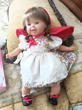 Preciosa muñeca vestida de Caperucita Roja. - Vestido floral con delantal blanco. - Capa roja. - Zapatos negros con lazo rosa.