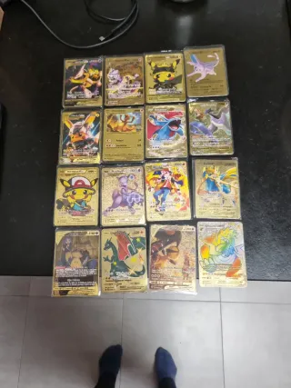 Conjunto de cartas Pokémon con acabado metálico dorado. Cada carta presenta un diseño brillante y detallado. - Cartas con arte exclusivo. - Acabado metálico de alta calidad. - Ideal para coleccionistas.