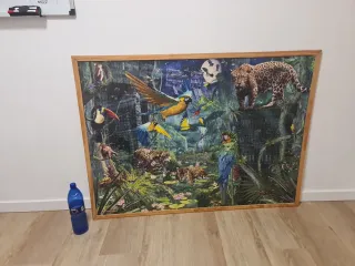 Puzzle de David Penfound con temática de selva y animales. - Marco de madera incluido. - Representa una escena selvática con jaguares y loros.