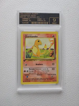 Carta de Charmander de la primera edición del set base de Pokémon, en español. La carta está protegida en un encapsulado de grading.