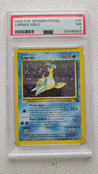 Carta Pokémon de Lapras, edición española del año 2000, con acabado holográfico y certificación PSA 7. - Pokémon: Lapras - Año: 2000 - Idioma: Español - Acabado: Holo - Certificación: PSA 7 - Número de carta: #10 - Set: Spanish Fossil