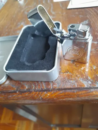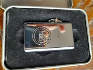 Encendedor vintage de la marca Lucky Strike, presentado en su estuche original. - Diseño metálico plateado. - Logo de Lucky Strike grabado en relieve.