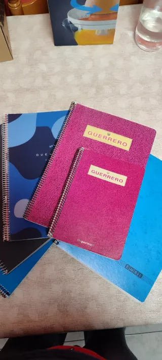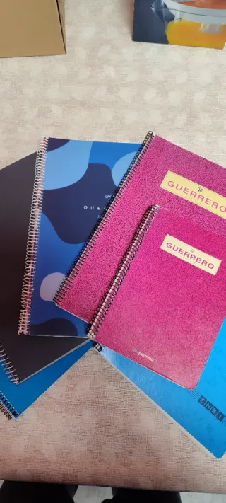 Lote de seis libretas con espiral, ideales para organizar tus apuntes. - Diseño de camuflaje azul. - Cubierta rosa con etiqueta GUERRERO (2 unidades). - Cubierta azul con texto. - Cubierta negra. - Cubierta azul con texto ENRI.