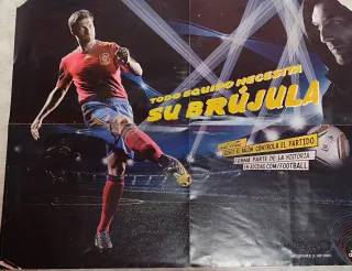 Póster promocional de Xabi Alonso con la selección española de fútbol, patrocinado por Adidas. - Diseño con el lema Todo equipo necesita su brújula. - Incluye el logo de Adidas. - Imagen de Xabi Alonso en acción. - Fondo de estadio con luces.