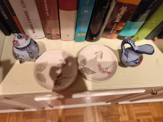 Conjunto de dos platillos decorados a mano con figuras. - Diseño floral y de hojas. - Figuras de cerámica pintadas a mano.