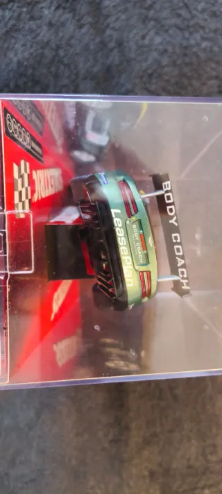 Coche de slot Aston Martin DBR9 de la marca Tecnitoys, parte de la colección Scalextric. - Modelo: Aston Martin DBR9 - Marca: Tecnitoys - Colección: Scalextric - Diseño deportivo en color verde con detalles en amarillo y dorsal 28. Nunca utilizado, sólo esposición.