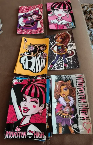 Colección de tarjetas coleccionables de Monster High. - Personajes icónicos de la serie. - Diseños coloridos y detallados. - Ideal para fans y coleccionistas. Cada una a 1.5. Dos por 2.5. Acepto ofertas razonables. En la última foto indico los números y entre paréntesis la cantidad de cada una.