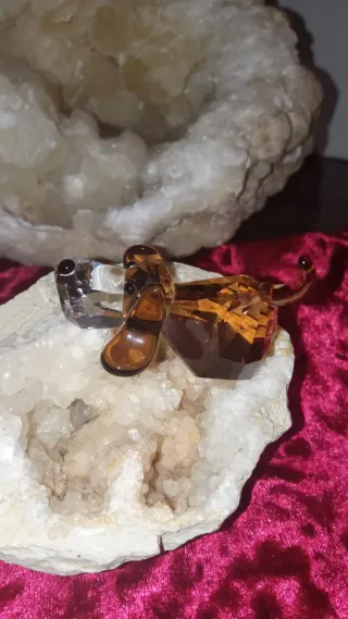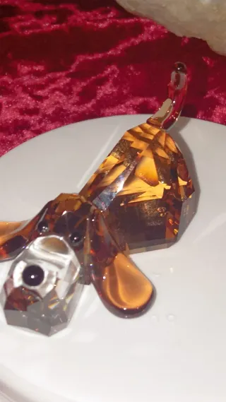 Figura de perro de colección de la marca Swarovski. Fabricada en cristal tallado con detalles en ámbar y transparente. - Diseño detallado de perro. - Incluye su caja original.