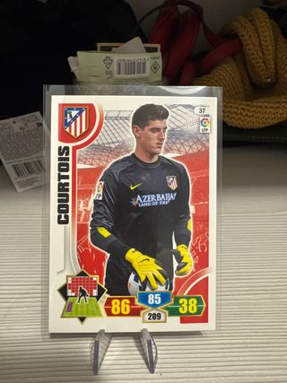 Tarjeta de colección del jugador Courtois, edición ROOKIE. - Incluye escudo del Atlético de Madrid. - Diseño con estadísticas del jugador.