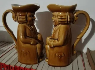 Set de dos jarras de cerveza de cerámica de la marca Tangra, fabricadas en Santander. Cada jarra tiene un diseño de figura masculina con sombrero y levita, sosteniendo una jarra.Sin picadas. - Material: Cerámica vidriada - Diseño: Figura masculina con sombrero y levita. - Marca: Tangra. - Origen: Santander.