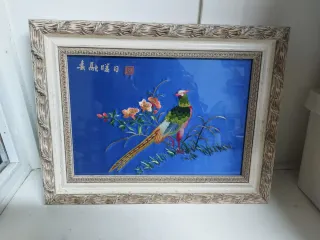 Precioso bordado tradicional chino sobre seda azul, representando un pájaro exótico posado sobre ramas con flores anaranjadas. La obra está enmarcada en un marco de madera con detalles tallados. - Técnica: Bordado a mano en hilo de seda. - Motivo: Pájaro y flores. - Soporte: Seda azul. - Marco: Madera con relieve. - Mide 31×41 cm