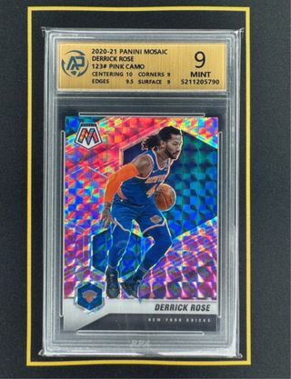 Tarjeta de baloncesto Panini Mosaic de Derrick Rose. - Edición: 2020-21 - Serie: Mosaic - Número de tarjeta: 123 - Variante: Pink Camo - Grado: 9 MINT - Puntuaciones: Centering 10, Corners 9, Edges 9.5, Surface 9 - Jugador: Derrick Rose - Equipo: New York Knicks #nba #basketball #ncaa #euroleague #acb #ligaendesa #jordan #nike #adidas #reebok #mitchellandness #champion #kobe #psa #card #cooper #flagg #auto #patch #jersey